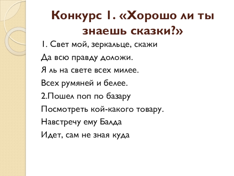 Конкурс 1. «Хорошо ли ты знаешь сказки?» 1. Свет мой, зеркальце, скажиДа всю правду доложи.Я ль на