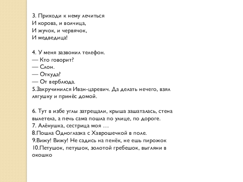 3. Приходи к нему лечитьсяИ корова, и волчица,И жучок, и червячок,И медведица! 4. У меня зазвонил телефон.—