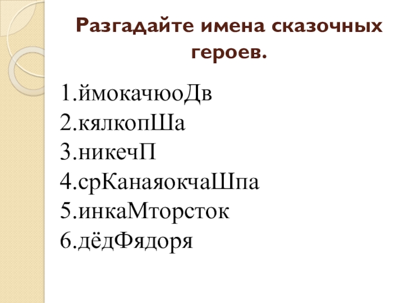 Разгадайте имена сказочных героев. 1.ймокачюоДв 2.кялкопШа 3.никечП 4.срКанаяокчаШпа5.инкаМторсток 6.дёдФядоря