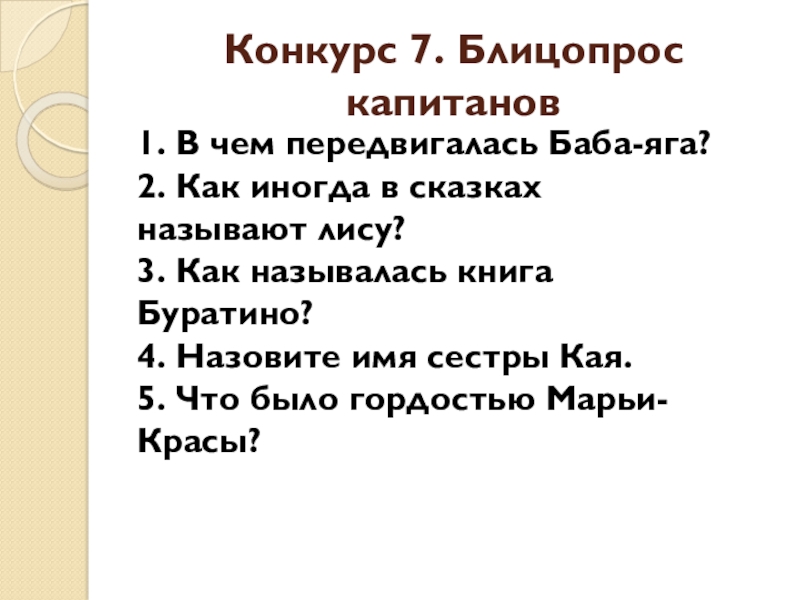 Конкурс 7. Блицопрос капитанов1. В чем передвигалась Баба-яга? 2. Как иногда в сказках называют лису? 3. Как