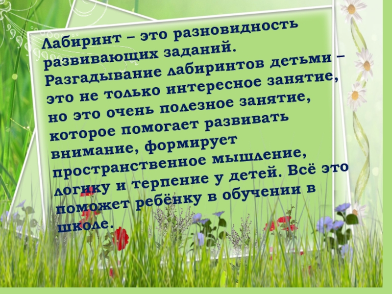 Слайд 2Лабиринт – это разновидность развивающих заданий. Разгадывание лабиринтов детьми – это