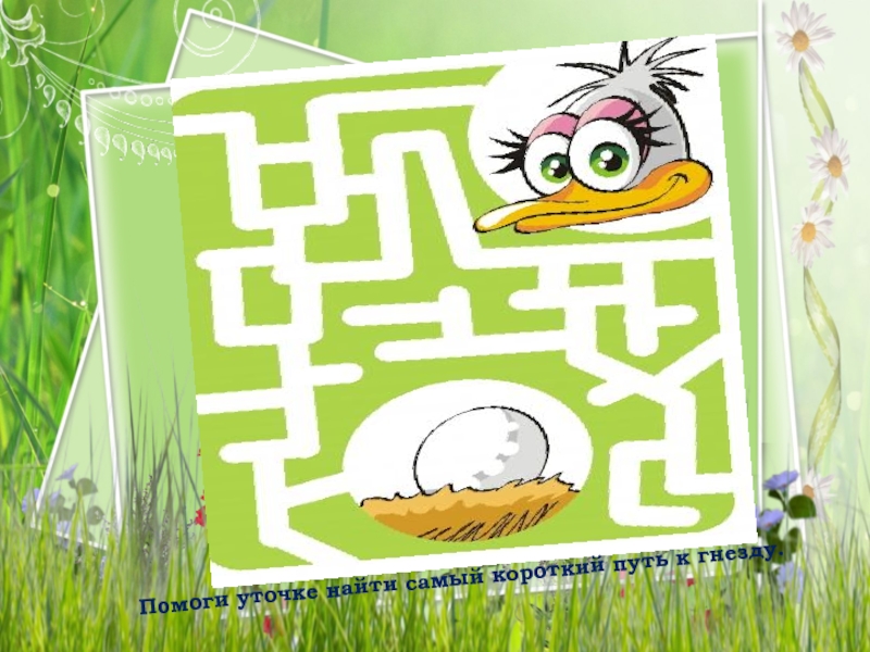 Слайд 3Помоги уточке найти самый короткий путь к гнезду.