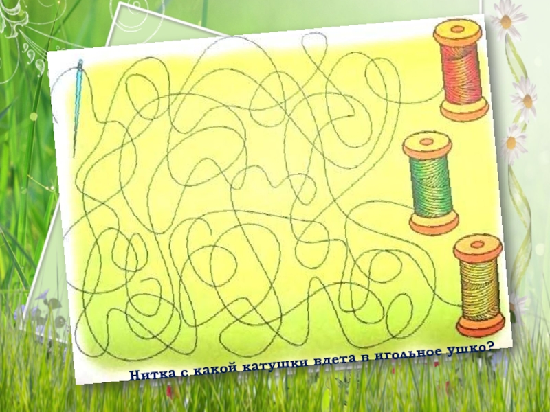 Слайд 9Нитка с какой катушки вдета в игольное ушко?