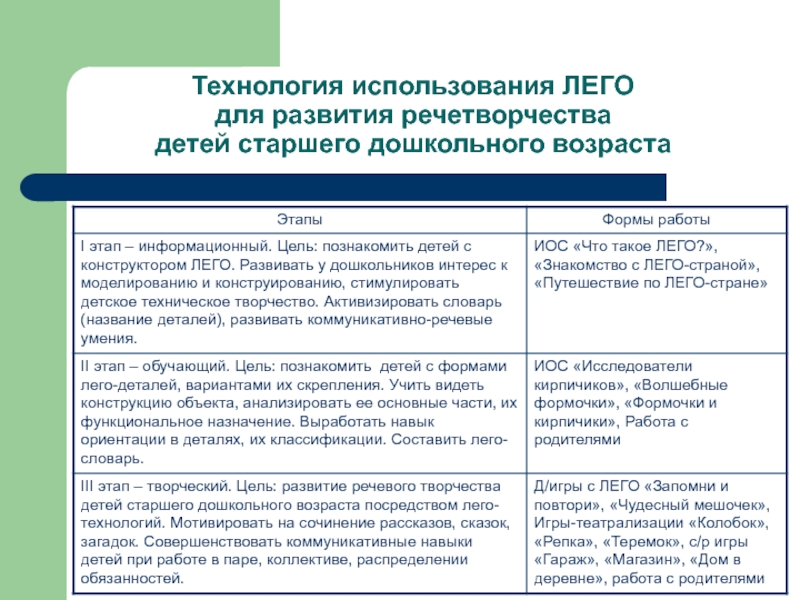ЛЕГО довольно широк. Воспитатель может использовать постройки из ЛЕГО для развития речевого творчества.