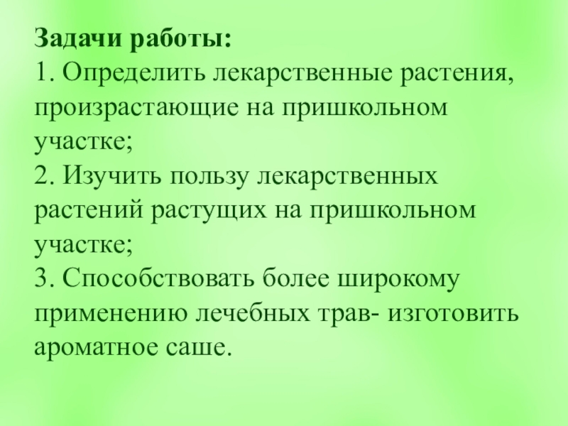 Слайд 3Задачи работы: 1. Определить лекарственные растения, произрастающие на пришкольном участке; 2. Изучить пользу