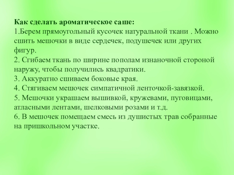 Слайд 8 Как сделать ароматическое саше: 1.Берем прямоугольный кусочек натуральной ткани . Можно сшить