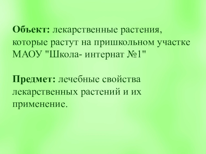 Слайд 4 Объект: лекарственные растения, которые растут на пришкольном участке МАОУ "Школа- интернат