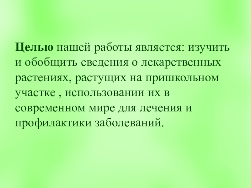 Целью нашей работы является: изучить и обобщить сведения о лекарственных растениях, растущих на пришкольном участке , использовании их в современном мире для лечения и профилактики заболеваний.