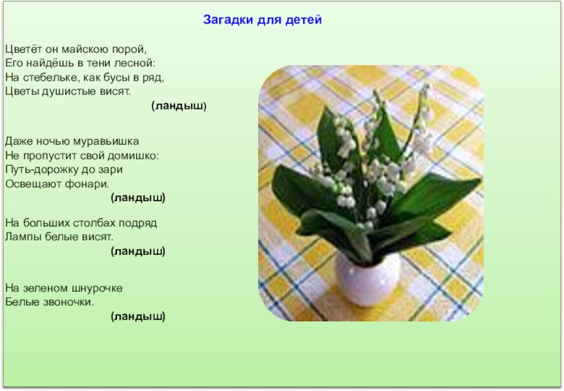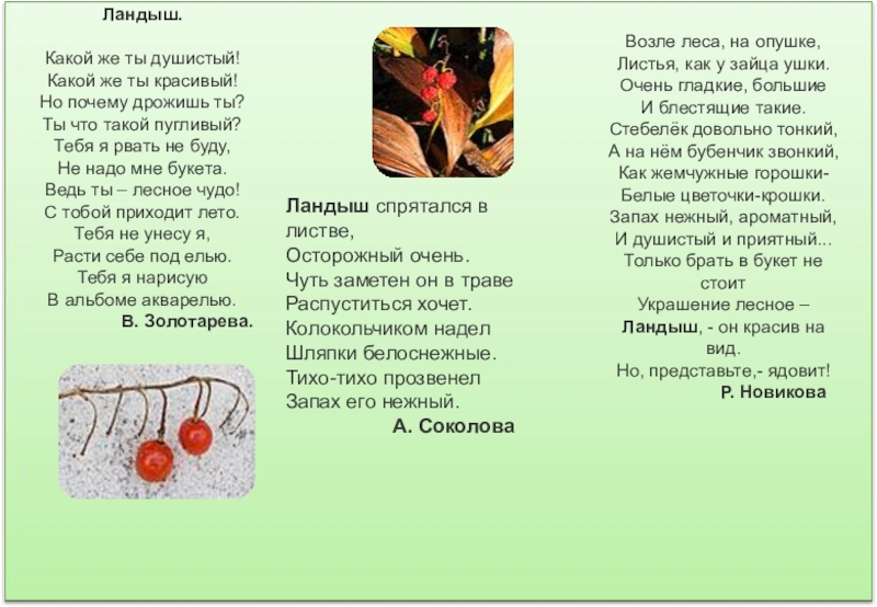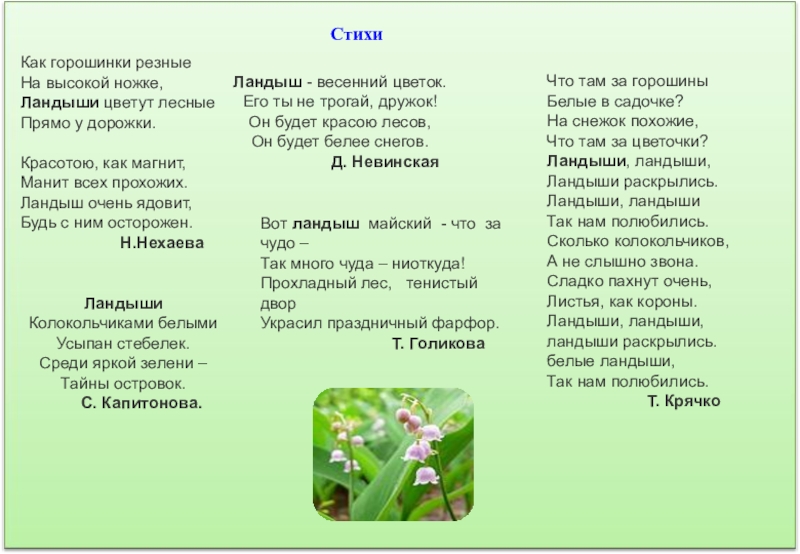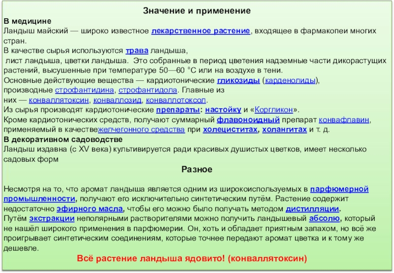 Несмотря на то, что аромат ландыша является одним из широкоиспользуемых в парфюмерной промышленности, получают его исключительно синтетическим путём. Растение содержит недостаточно эфирного масла, чтобы его можно было получать методом дистилляции. Путём экстракции неполярными растворителями можно получить ландышевый абсолю, который не нашёл широкого применения в парфюмерии. Он, хоть и обладает приятным запахом, но всё же проигрывает синтетическим соединениям, которые точнее передают аромат цветка и к тому же дешевле.