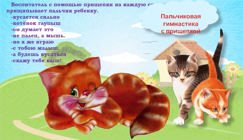 9. Взрослый с помощью прищепки на каждую строчку прищипывает пальчик ребенку.
