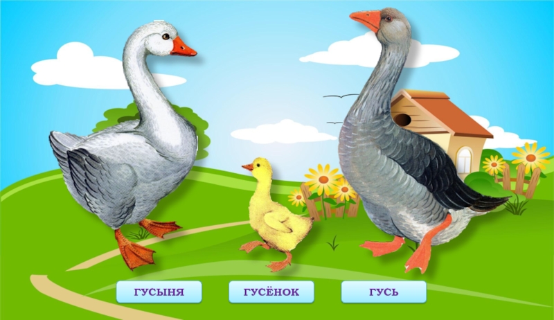 - Это папа – гусь, это мама – гусыня, а это птенец – гусенок. И т. д.