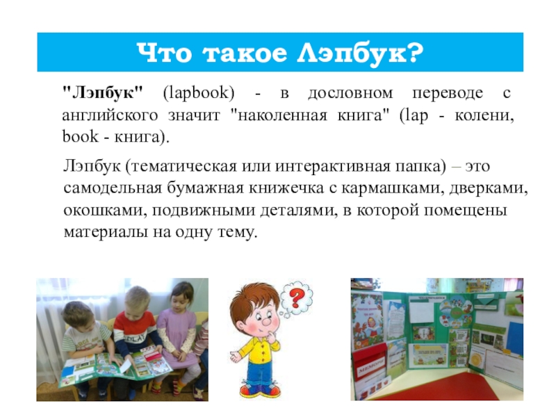 Лэпбук (тематическая или интерактивная папка) – это самодельная бумажная книжечка с кармашками, дверками, окошками, подвижными деталями, в которой помещены материалы на одну тему.
