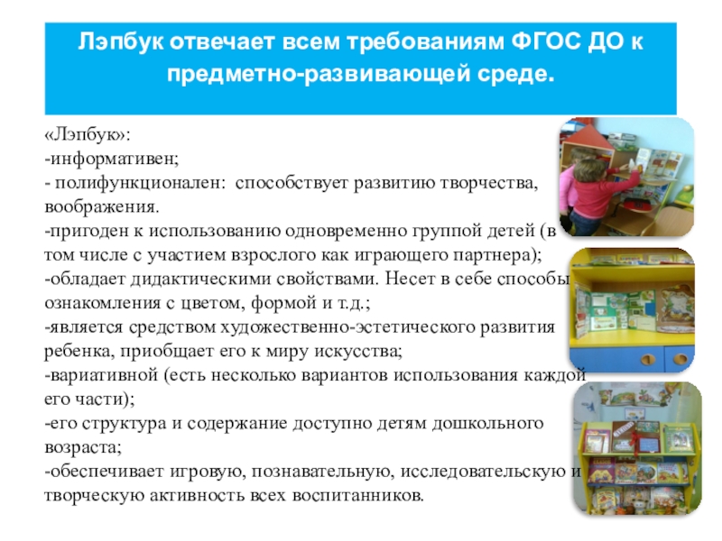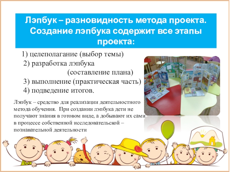 Лэпбук – средство для реализации деятельностного метода обучения. При создании лэпбука дети не получают знания в готовом виде, а добывают их сами в процессе собственной исследовательской – познавательной деятельности