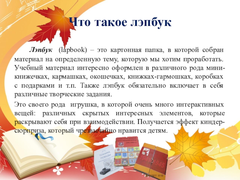 Что такое лэпбук Лэпбук (lapbook) – это картонная папка, в которой собран материал на определенную тему, которую мы хотим проработать. Учебный материал интересно оформлен в различного рода мини-книжечках, кармашках, окошечках, книжках-гармошках, коробках с