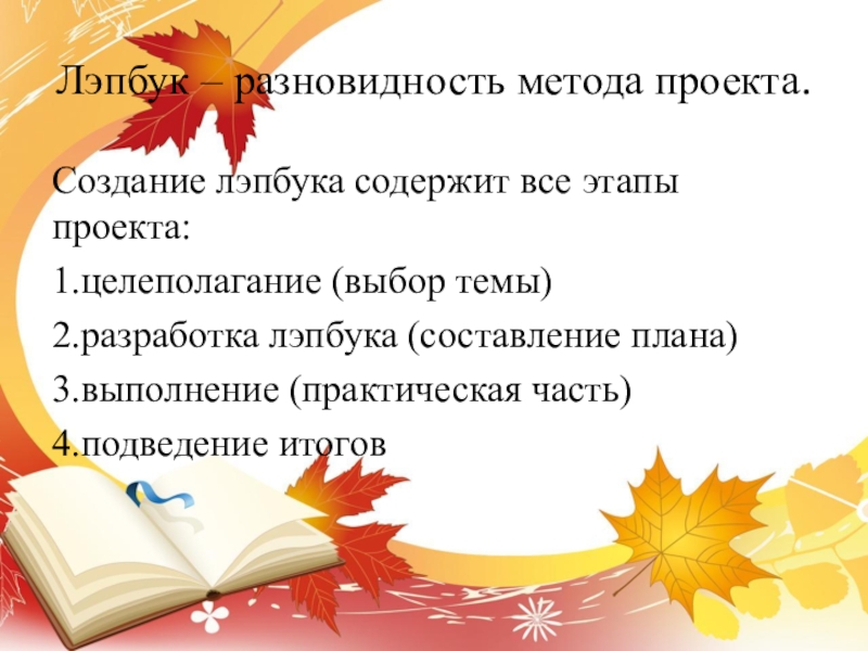 Лэпбук – разновидность метода проекта.  Создание лэпбука содержит все этапы проекта: 1.целеполагание (выбор темы) 2.разработка лэпбука