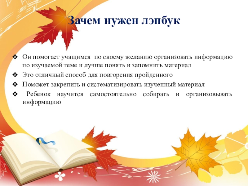 Зачем нужен лэпбук  Он помогает учащимся по своему желанию организовать информацию по изучаемой теме и лучше