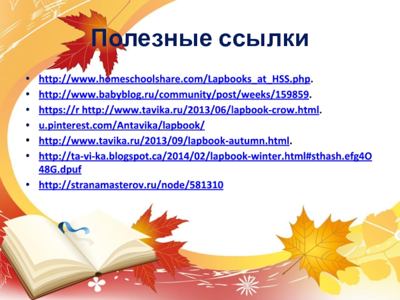 Полезные ссылкиhttp://www.homeschoolshare.com/Lapbooks_at_HSS.php.http://www.babyblog.ru/community/post/weeks/159859.https://r http://www.tavika.ru/2013/06/lapbook-crow.html.u.pinterest.com/Antavika/lapbook/http://www.tavika.ru/2013/09/lapbook-autumn.html.http://ta-vi-ka.blogspot.ca/2014/02/lapbook-winter.html#sthash.efg4O48G.dpufhttp://stranamasterov.ru/node/581310
