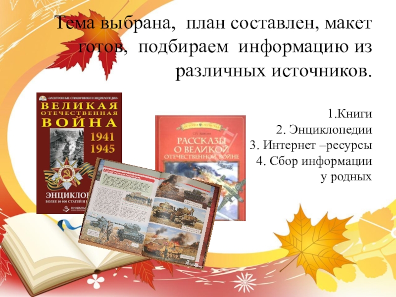 Слайд 11 Тема выбрана, план составлен, макет готов, подбираем информацию из различных источников. 1.Книги 2.