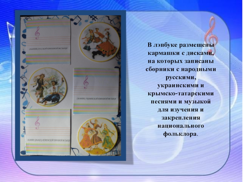Слайд 20В лэпбуке размещены кармашки с дисками, на которых записаны сборники с