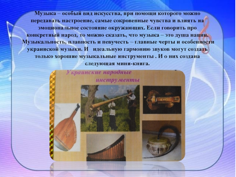самые сокровенные чувства и влиять на эмоциональное состояние окружающих. Если говорить про конкретный народ, то можно сказать, что музыка – это душа нации. Музыкальность, плавность и певучесть – главные черты и особенности украинской музыки. И идеальную гармонию звуков могут создать только хорошие музыкальные инструменты . И о них создана следующая мини-книга.