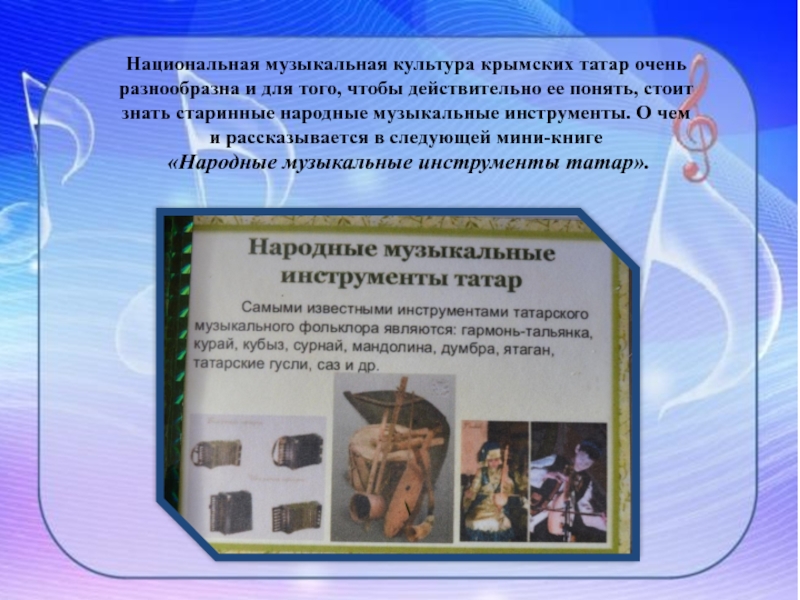 Слайд 19Национальная музыкальная культура крымских татар очень разнообразна и для того, чтобы