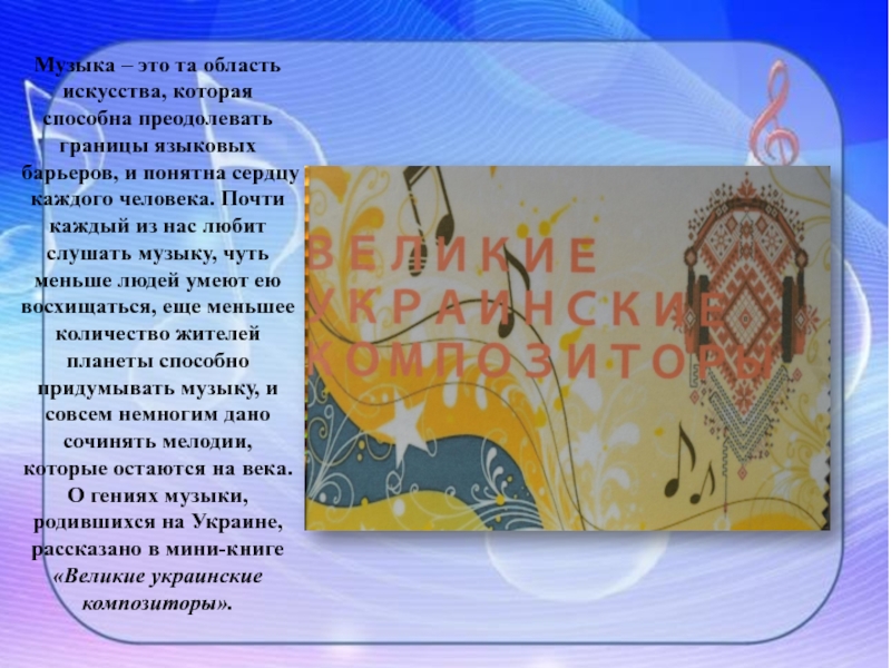 барьеров, и понятна сердцу каждого человека. Почти каждый из нас любит слушать музыку, чуть меньше людей умеют ею восхищаться, еще меньшее количество жителей планеты способно придумывать музыку, и совсем немногим дано сочинять мелодии, которые остаются на века. О гениях музыки, родившихся на Украине, рассказано в мини-книге «Великие украинские композиторы».