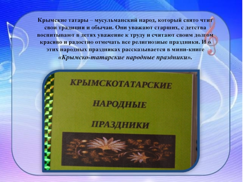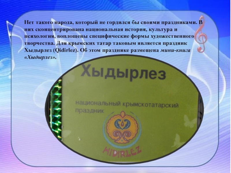 сконцентрирована национальная история, культура и психология, воплощены специфические формы художественного творчества. Для крымских татар таковым является праздник Хыдырлез (Qidirlez). Об этом празднике размещена мини-книга «Хыдырлез».