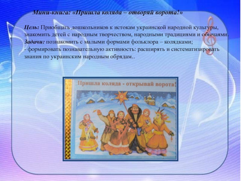 Задачи: познакомить с малыми формами фольклора – колядками;