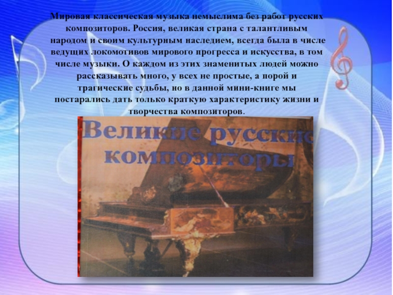 Слайд 12Мировая классическая музыка немыслима без работ русских композиторов. Россия, великая страна