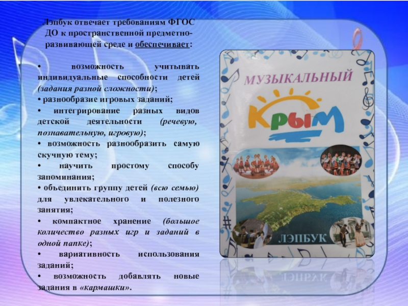 Слайд 3Лэпбук «Музыкальный Крым» предназначен для использования закрепления и повторения пройденного