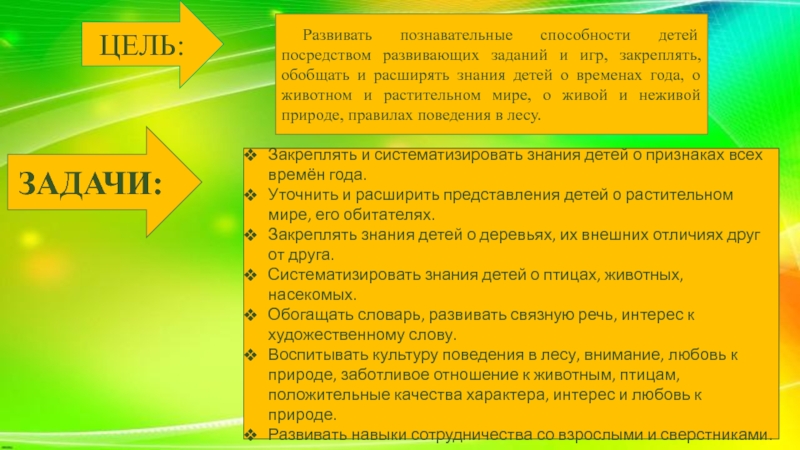 Уточнить и расширить представления детей о растительном мире, его обитателях.
