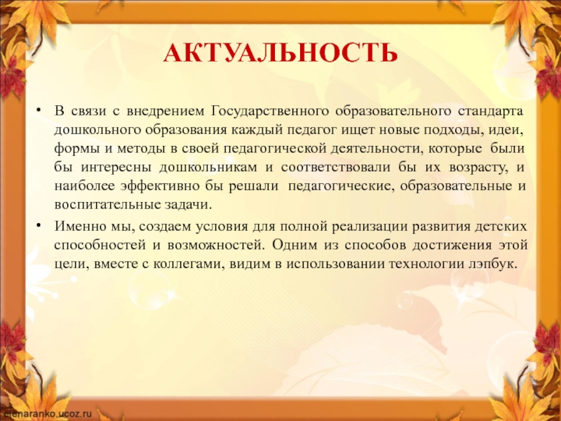 АКТУАЛЬНОСТЬВ связи с внедрением Государственного образовательного стандарта дошкольного образования каждый педагог ищет новые подходы, идеи, формы и