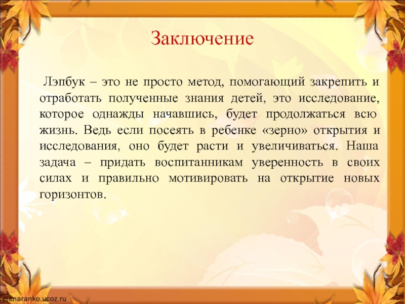 Заключение   Лэпбук – это не просто метод, помогающий закрепить и отработать полученные знания детей, это
