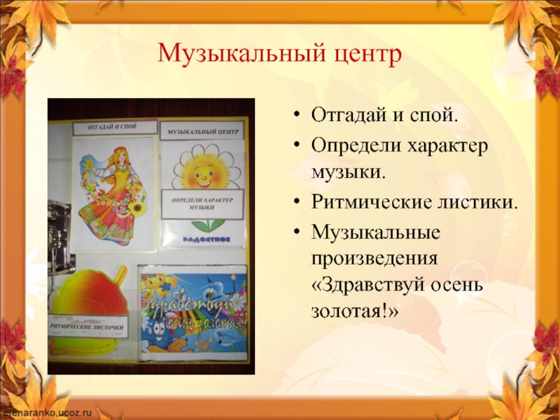 Музыкальный центрОтгадай и спой.Определи характер музыки.Ритмические листики.Музыкальные произведения «Здравствуй осень золотая!»