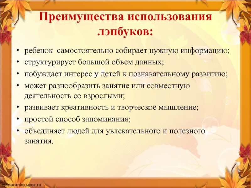 Слайд 5Преимущества использования лэпбуков:
