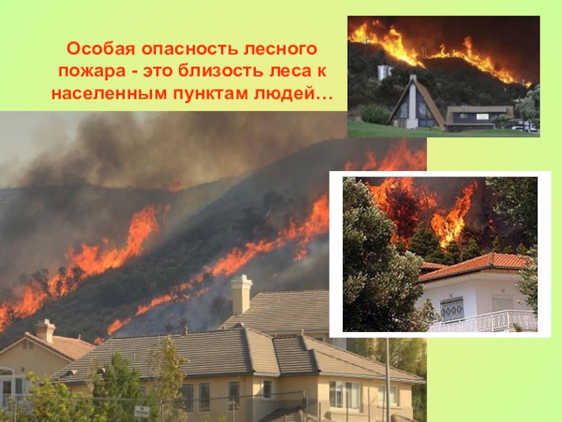 Слайд 9Особая опасность лесного пожара - это близость леса к населенным пунктам
