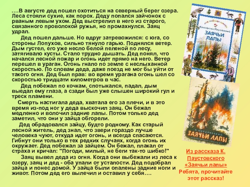 Дед обрадовался зайцу, будто родному. Как старый лесной житель, дед знал, что звери гораздо лучше человека чуют, откуда идет огонь, и всегда спасаются. Гибнут они только в тех редких случаях, когда огонь их окружает. Дед побежал за зайцем. Он бежал, плакал от страха и кричал: "Погоди, милый, не беги так-то шибко!"
