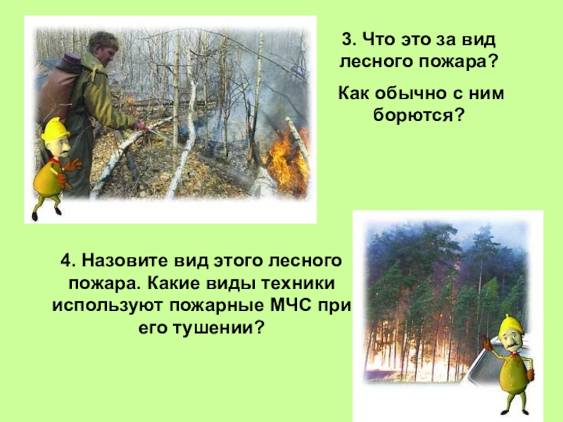 4. Назовите вид этого лесного пожара. Какие виды техники используют пожарные МЧС при его тушении?