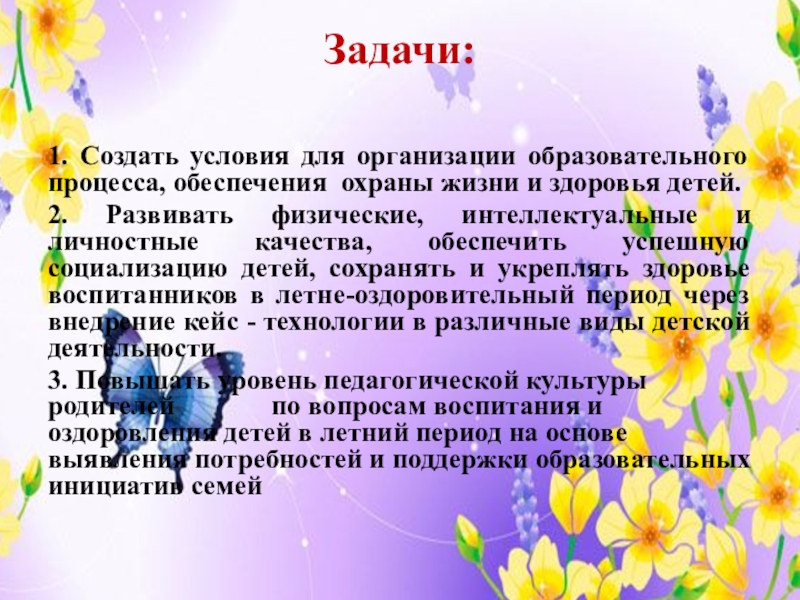 Задачи:  1. Создать условия для организации образовательного процесса, обеспечения охраны жизни и здоровья детей.2. Развивать физические,