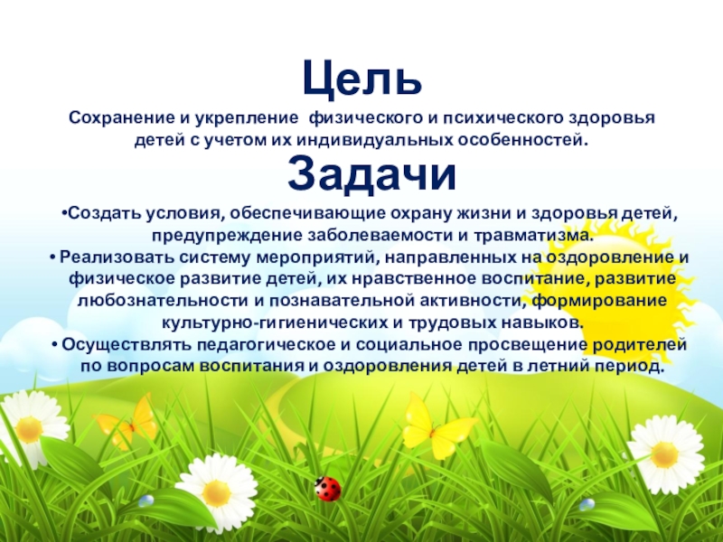 Реализовать систему мероприятий, направленных на оздоровление и физическое развитие детей, их нравственное воспитание, развитие любознательности и познавательной активности, формирование культурно-гигиенических и трудовых навыков.