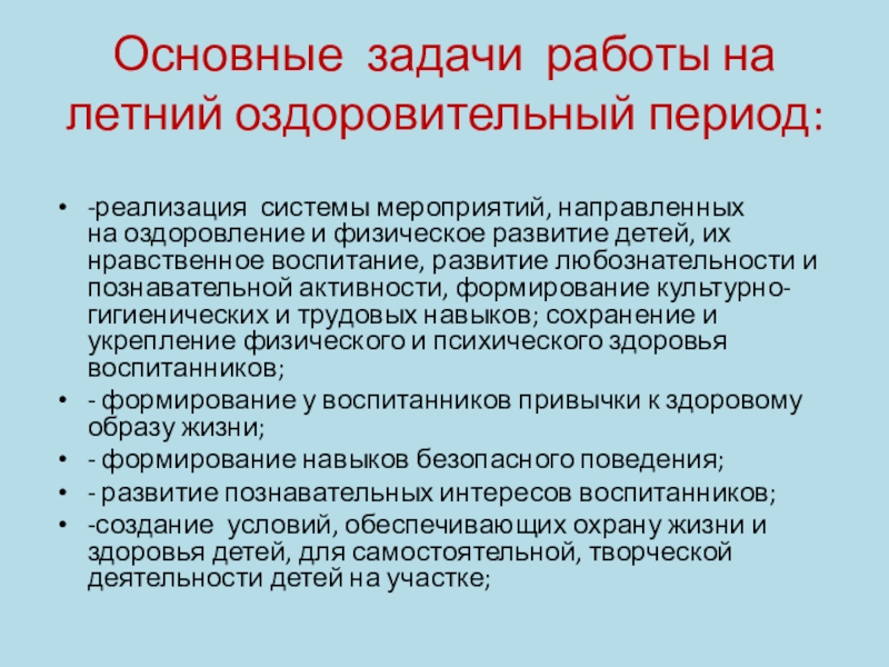 Основные задачи  работы на летний оздоровительный период: -реализация системы мероприятий, направленных на оздоровление и физическое развитие детей, их нравственное