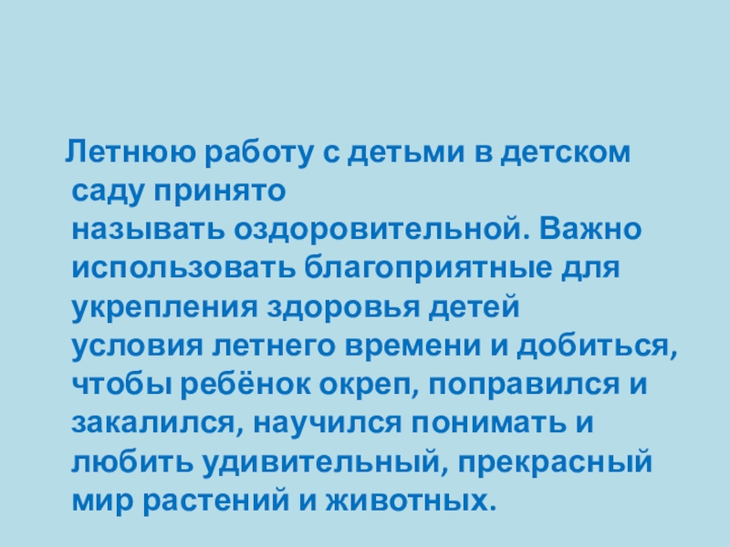 Летнюю работу с детьми в детском саду принято называть оздоровительной. Важно использовать благоприятные для укрепления здоровья детей условия летнего времени и добиться, чтобы ребёнок окреп, поправился и закалился, научился понимать и любить удивительный, прекрасный мир растений и