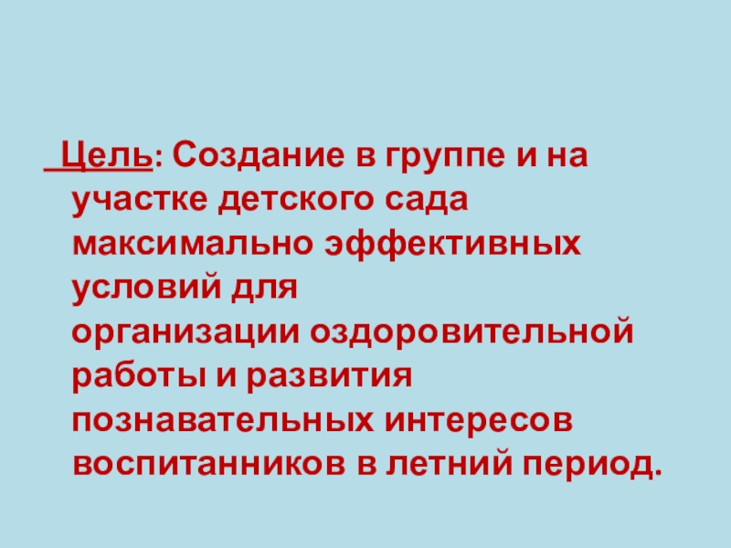 использовать благоприятные для укрепления здоровья детей условия летнего времени и добиться, чтобы ребёнок окреп, поправился и закалился, научился понимать и любить удивительный, прекрасный мир растений и животных.