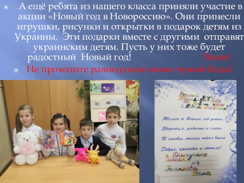 «Новый год в Новороссию». Они принесли игрушки, рисунки и открытки в подарок детям из Украины. Эти подарки вместе с другими отправят украинским детям. Пусть у них тоже будет радостный Новый год! Люди!