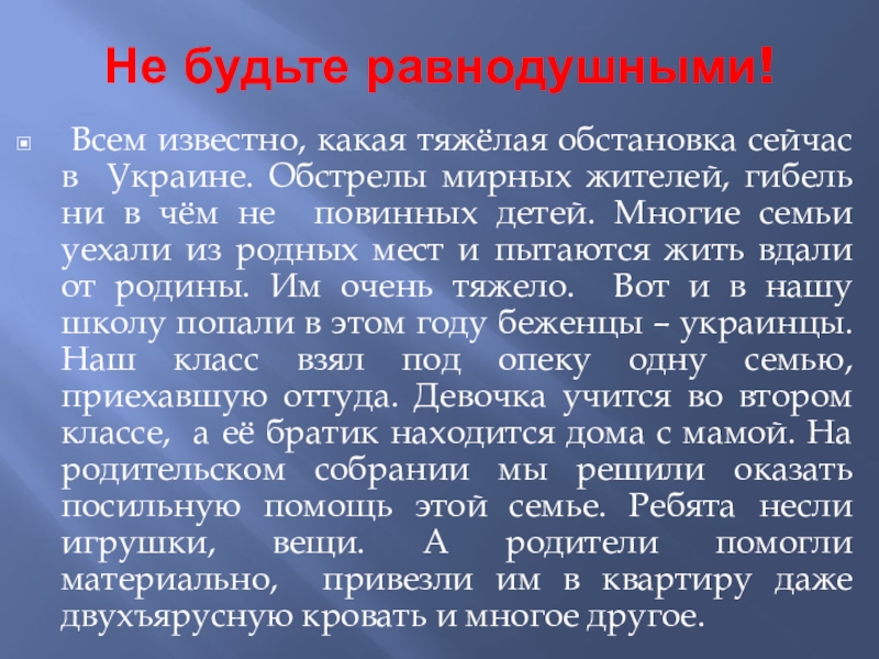 Обстрелы мирных жителей, гибель ни в чём не повинных детей. Многие семьи уехали из родных мест и пытаются жить вдали от родины. Им очень тяжело. Вот и в нашу школу попали в этом году беженцы – украинцы. Наш класс взял под опеку одну семью, приехавшую оттуда. Девочка учится во втором классе, а её братик находится дома с мамой. На родительском собрании мы решили оказать посильную помощь этой семье. Ребята несли игрушки, вещи. А родители помогли материально, привезли им в квартиру даже двухъярусную кровать и многое другое.