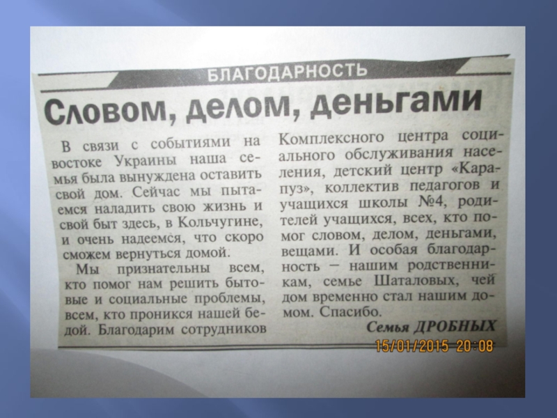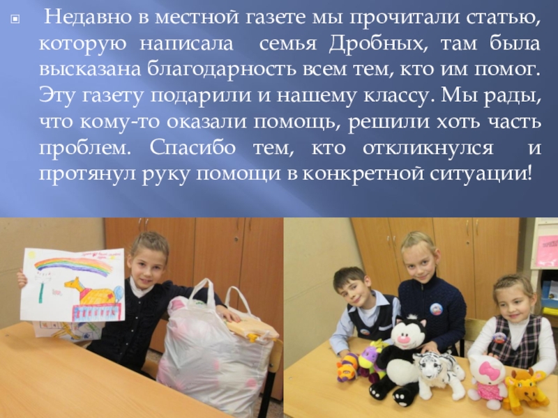 Дробных, там была высказана благодарность всем тем, кто им помог. Эту газету подарили и нашему классу. Мы рады, что кому-то оказали помощь, решили хоть часть проблем. Спасибо тем, кто откликнулся и протянул руку помощи в конкретной ситуации!
