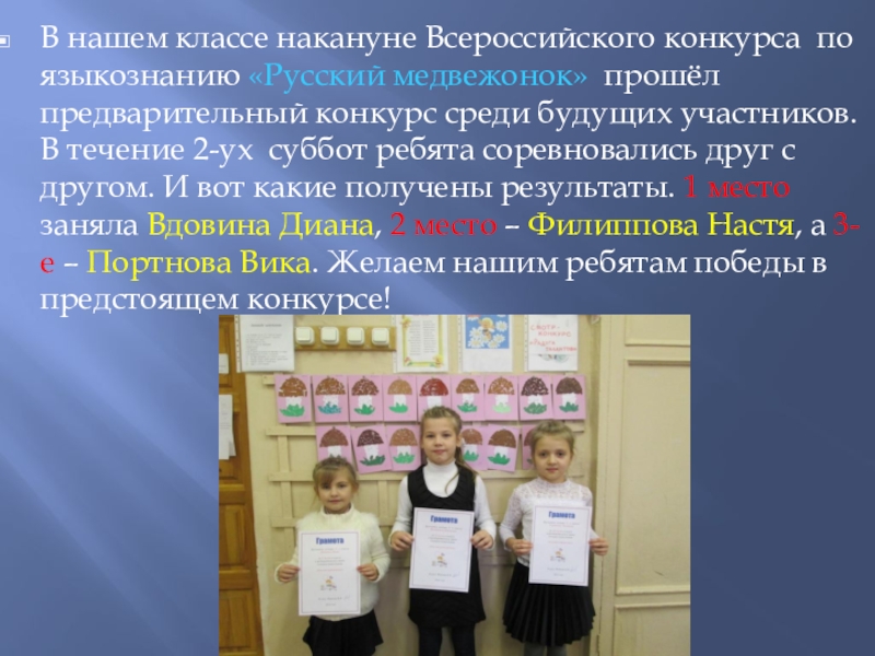 Слайд 3В нашем классе накануне Всероссийского конкурса по языкознанию «Русский медвежонок» прошёл