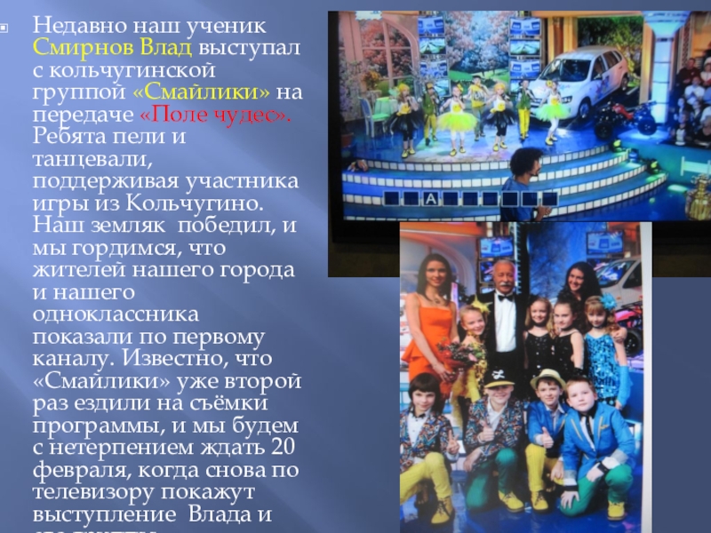 передаче «Поле чудес». Ребята пели и танцевали, поддерживая участника игры из Кольчугино. Наш земляк победил, и мы гордимся, что жителей нашего города и нашего одноклассника показали по первому каналу. Известно, что «Смайлики» уже второй раз ездили на съёмки программы, и мы будем с нетерпением ждать 20 февраля, когда снова по телевизору покажут выступление Влада и его группы.