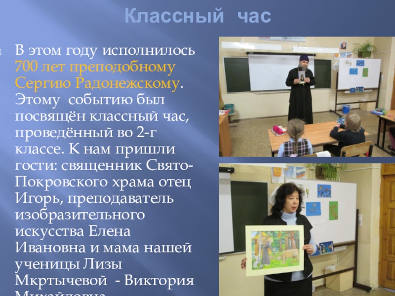 событию был посвящён классный час, проведённый во 2-г классе. К нам пришли гости: священник Свято-Покровского храма отец Игорь, преподаватель изобразительного искусства Елена Ивановна и мама нашей ученицы Лизы Мкртычевой - Виктория Михайловна.