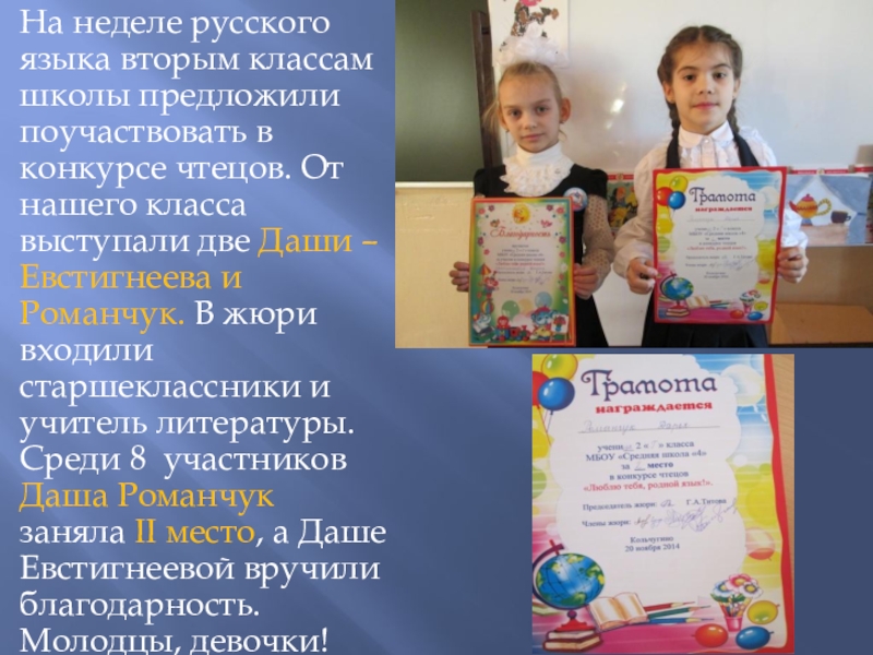 чтецов. От нашего класса выступали две Даши – Евстигнеева и Романчук. В жюри входили старшеклассники и учитель литературы. Среди 8 участников Даша Романчук заняла II место, а Дашe Евстигнеевой вручили благодарность. Молодцы, девочки!